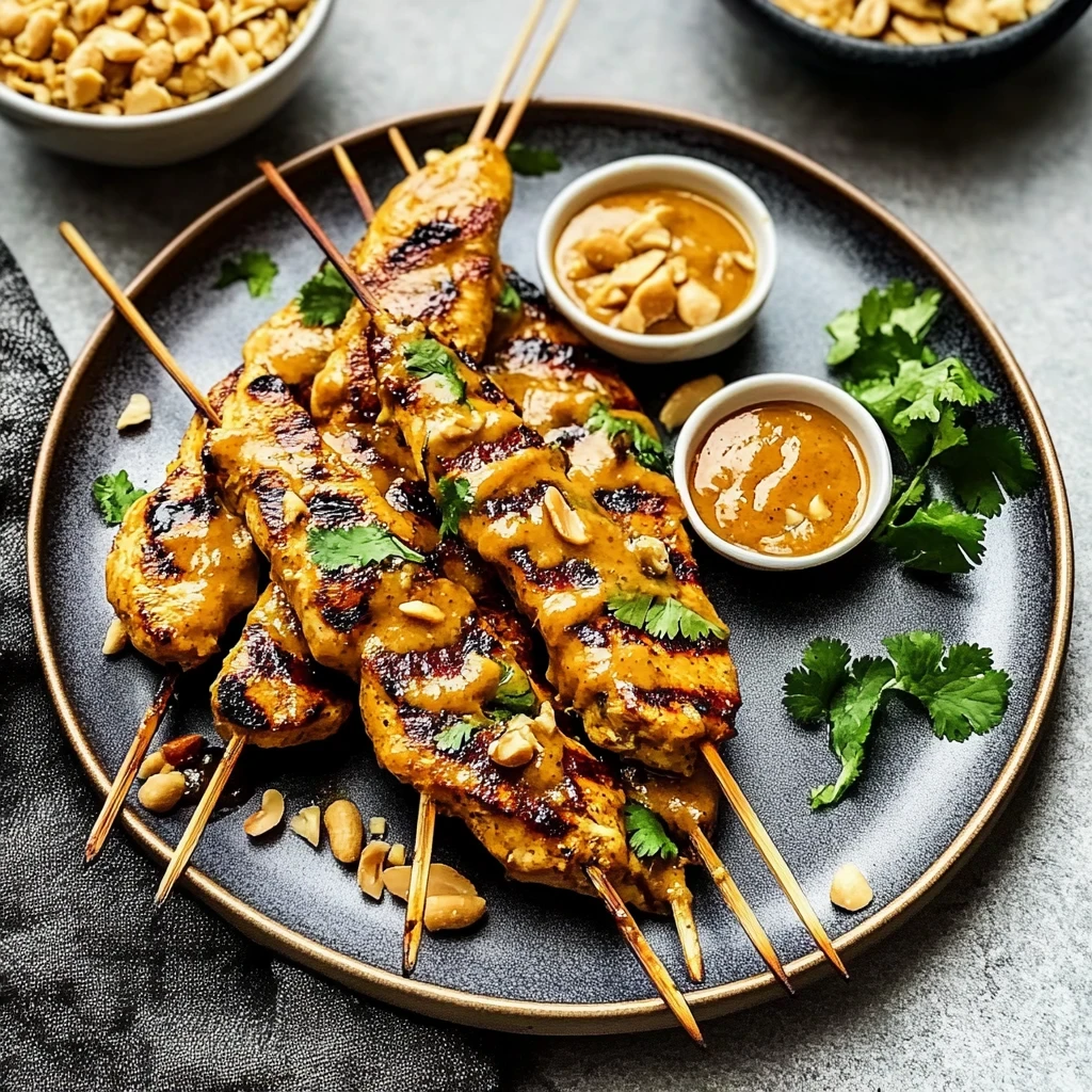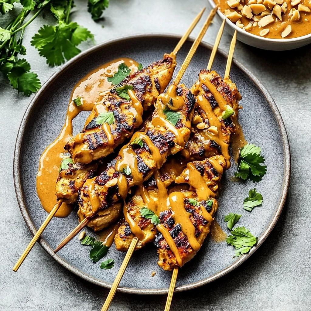 After grilling your skewers to perfection, serve them alongside the prepared peanut sauce. For an added touch of flavor and presentation, garnish with chopped cilantro and peanuts before serving. Enjoy this delightful dish that beautifully combines tender chicken with a rich peanut sauce!