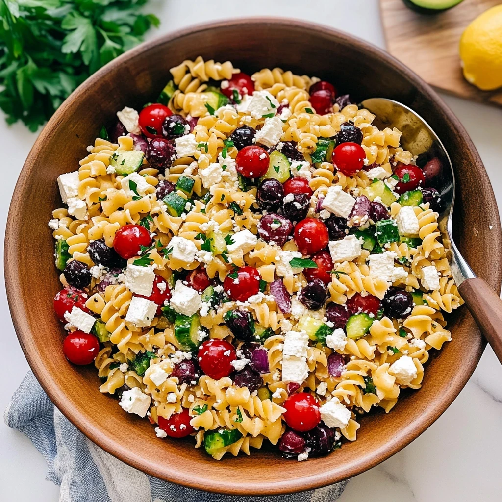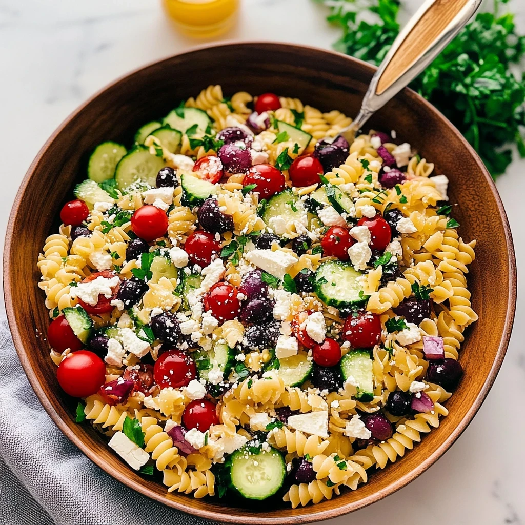 Gather Your Ingredients: Start by assembling all your fresh ingredients on the counter. You’ll need pasta, cherry tomatoes, cucumbers, red onion, Kalamata olives, feta cheese, and fresh herbs like parsley or oregano. As you chop the vibrant vegetables, enjoy their crisp textures and enticing aromas filling your kitchen. A good quality olive oil and a splash of red wine vinegar will be essential for that classic Greek flavor. Make sure to rinse your pasta under cold water after cooking—it helps cool it down and prevents sticking.