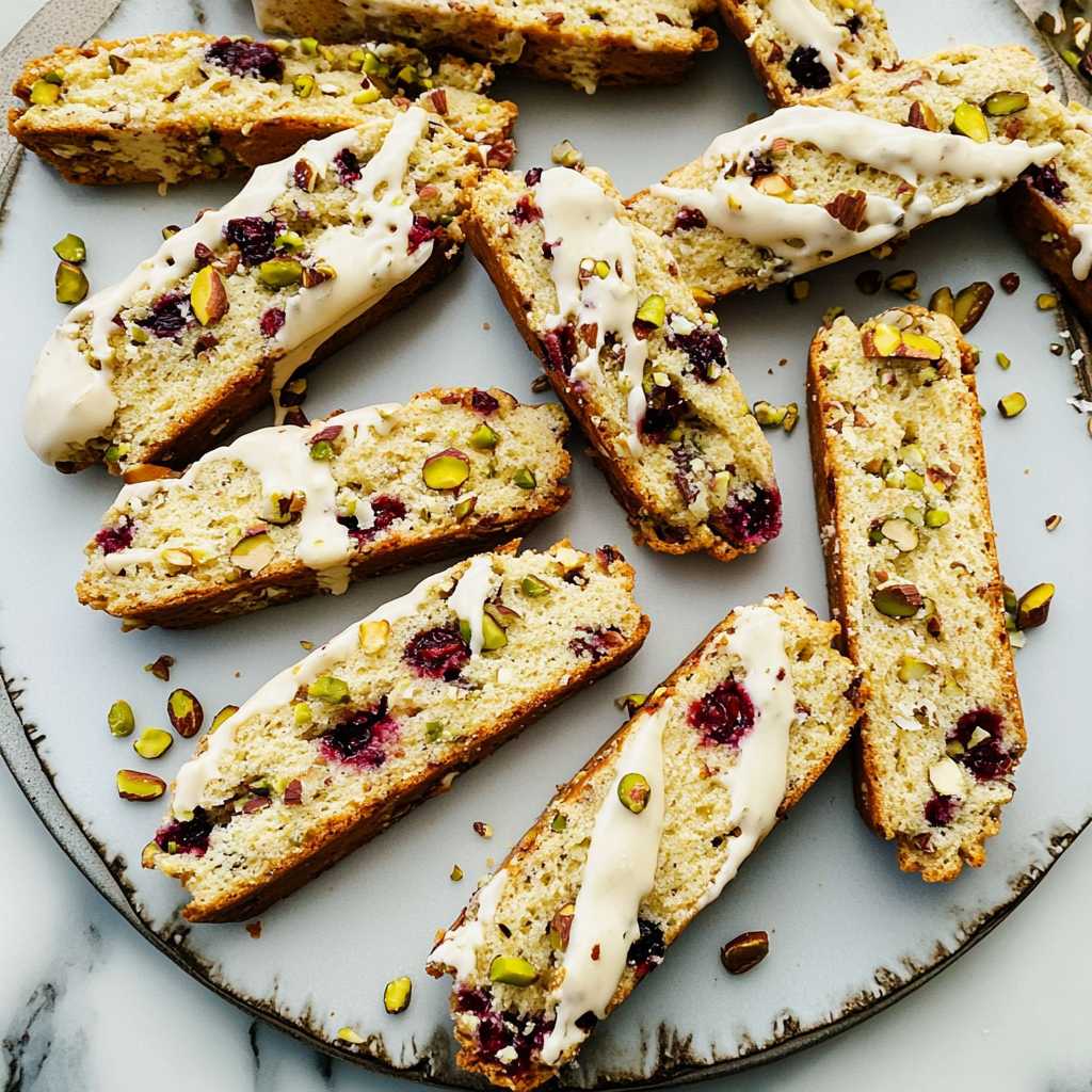 Cranberry Pistachio Biscotti are crunchy, golden-brown treats that combine the tartness of cranberries with the rich flavor of pistachios. Perfect for dunking into coffee or enjoying as a snack, these biscotti evoke nostalgia and warmth, making them an ideal addition to any festive gathering or a delightful everyday indulgence.