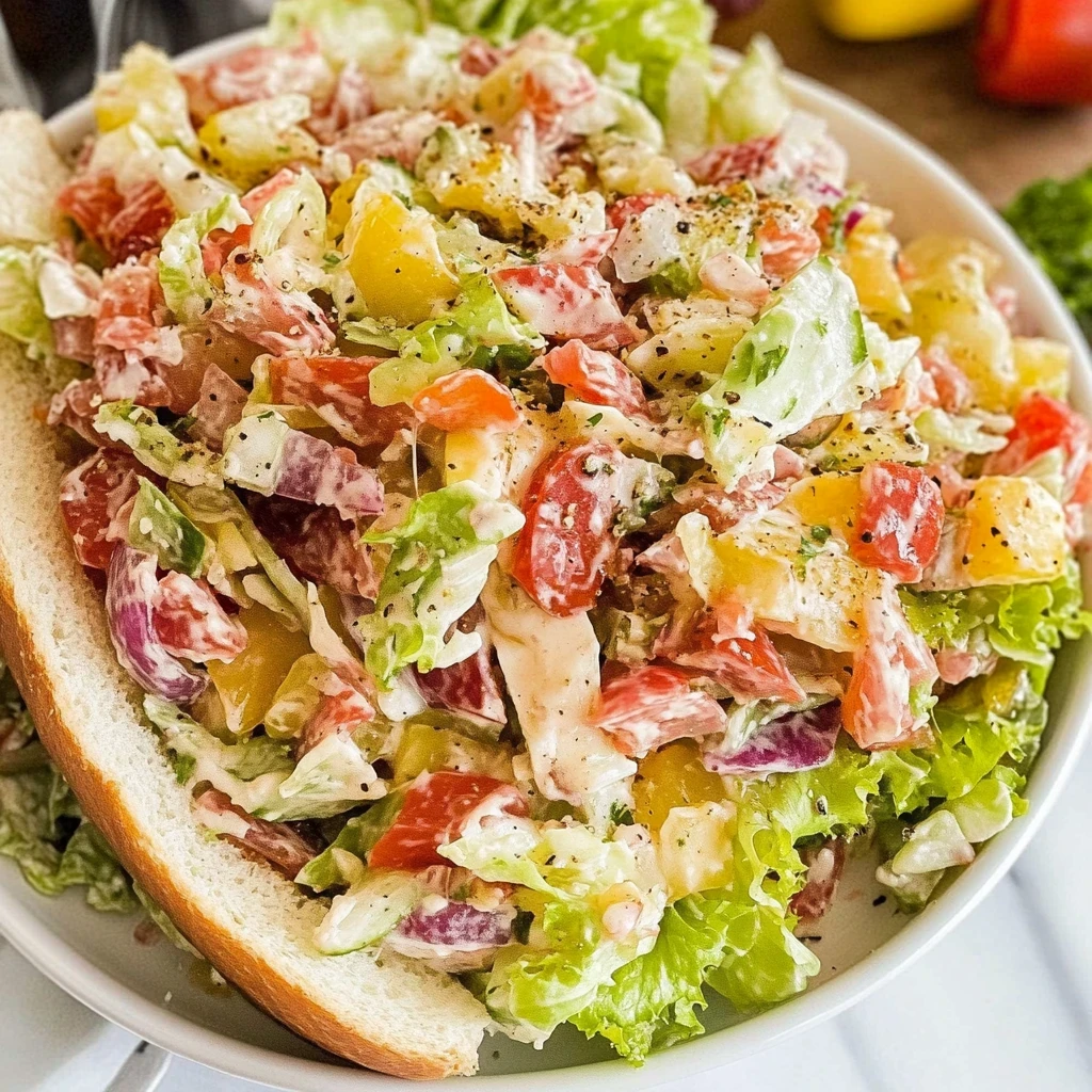Combine and Serve: Now comes the fun part! Drizzle that delightful dressing over your colorful salad mixture. With a gentle touch, toss everything together so each piece is lovingly coated in that flavorful dressing. The bright colors should glisten as they come together harmoniously. This is where all your hard work pays off—serving this italian sub salad immediately ensures that those fresh flavors are at their peak! Grab some bowls or plates, serve up generous portions, and enjoy every delicious bite with family or friends.
