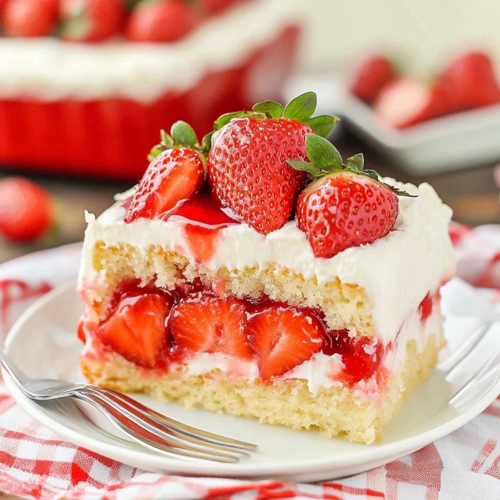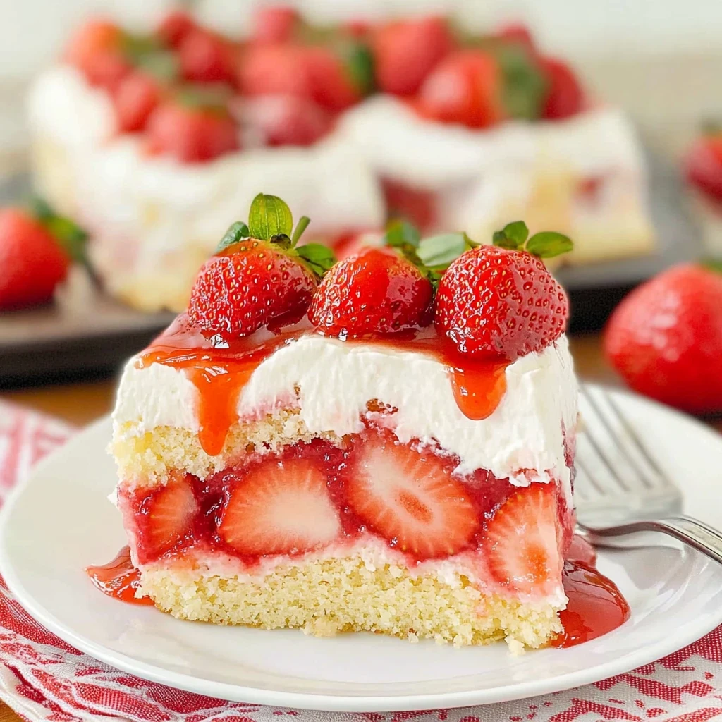 Imagine slicing into a fluffy strawberry poke cake with condensed milk, where each bite bursts with sweet, juicy strawberries and creamy goodness. The vibrant pink hue and luscious whipped cream topping call to mind sun-soaked picnics and joyous birthday parties, making it the perfect dessert for any occasion.